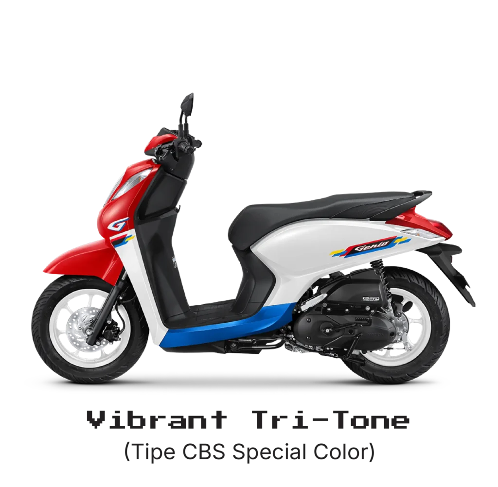 New Honda Genio 2025 mempertahankan desain kompak dan dinamis yang sudah menjadi ciri khasnya, ditambah pilihan warna baru yang lebih ekspresif. Varian CBS mendapat dua warna special dengan velg putih — Vibrant Tri-Tone (merah, putih, biru) dan Vibrant Black & White — serta warna Vibrant Black yang tetap mempertahankan kesan retro. Sementara varian CBS-ISS hadir dengan pilihan warna Fabulous Matte (Brown, Green, Black) yang elegan dan minimalis.